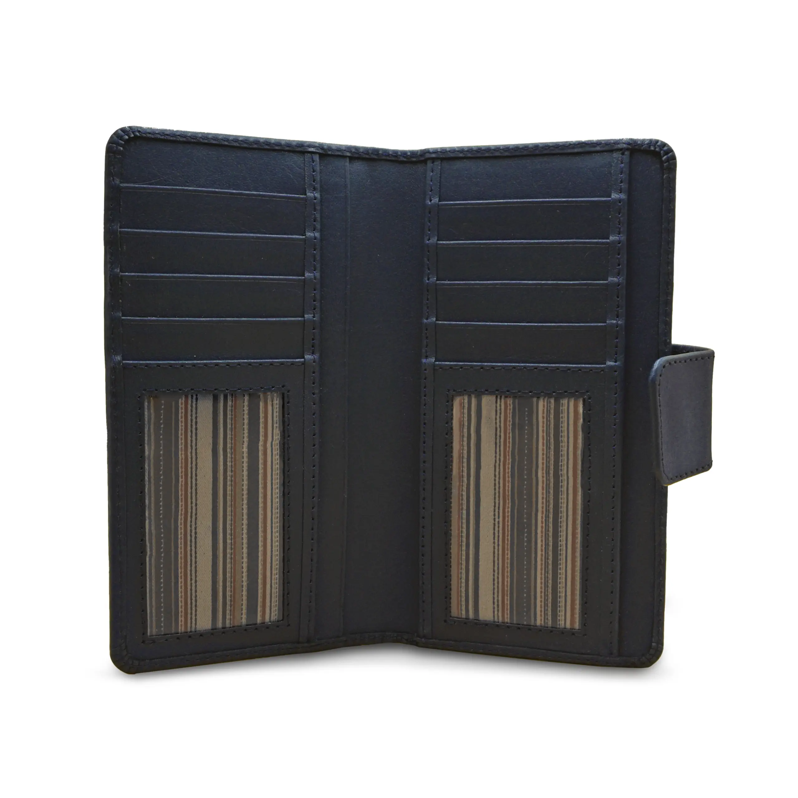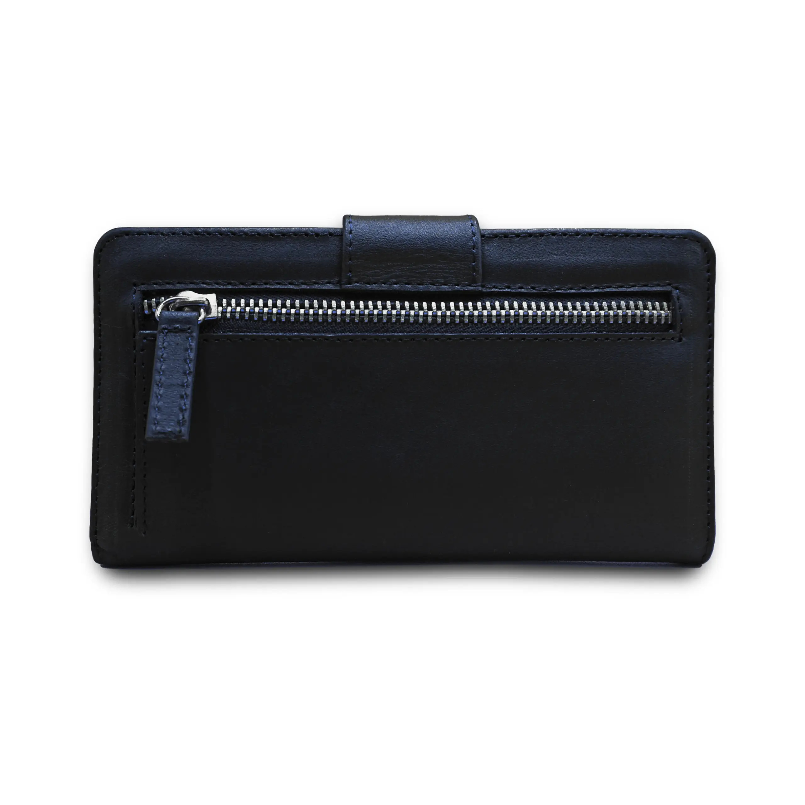 Cartera de piel Nappa en color azul, confeccionada con cuero de res seleccionado por su suavidad al tacto y resistencia natural.