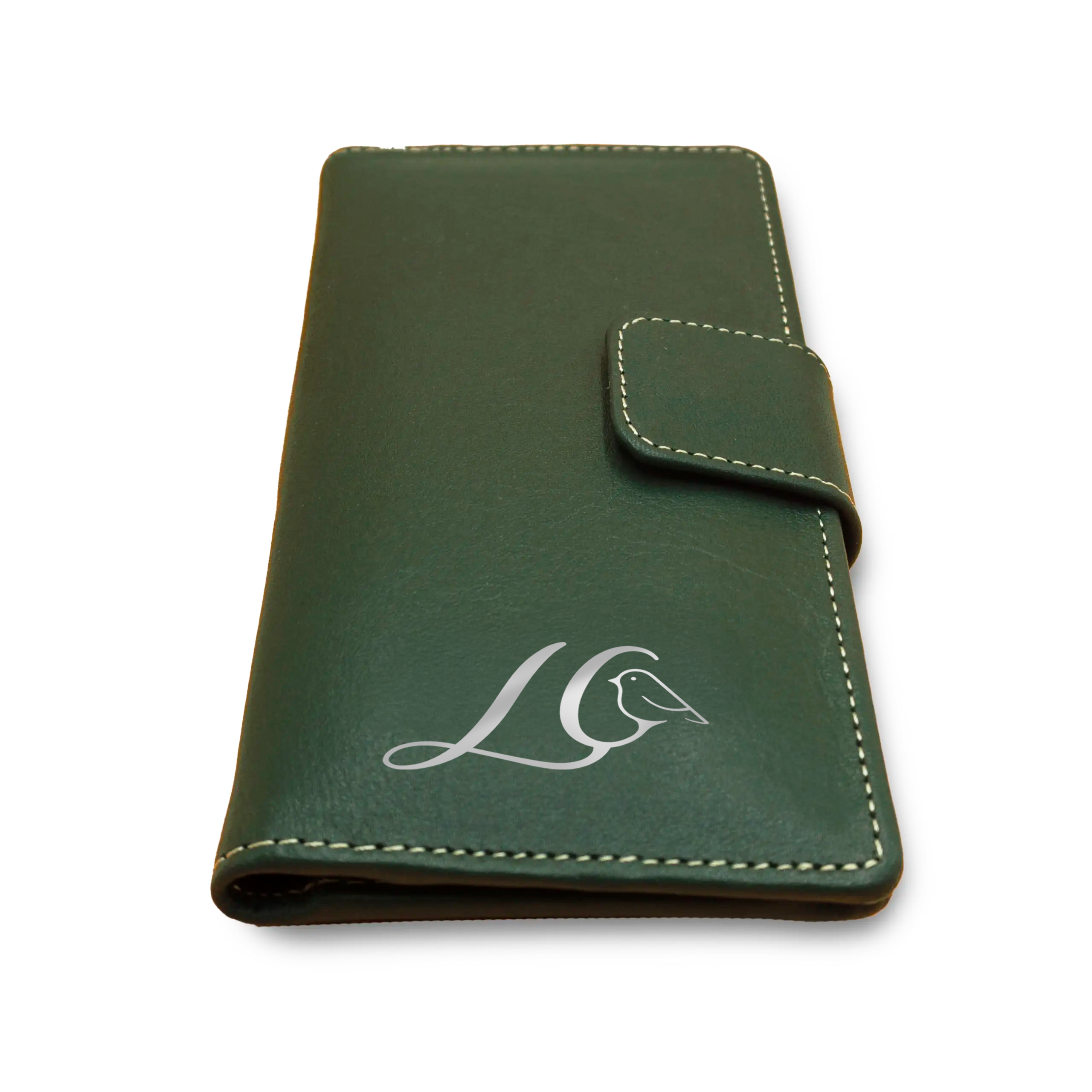 Cartera de piel Nappa en color verde, confeccionada con cuero de res seleccionado por su suavidad al tacto y resistencia natural.